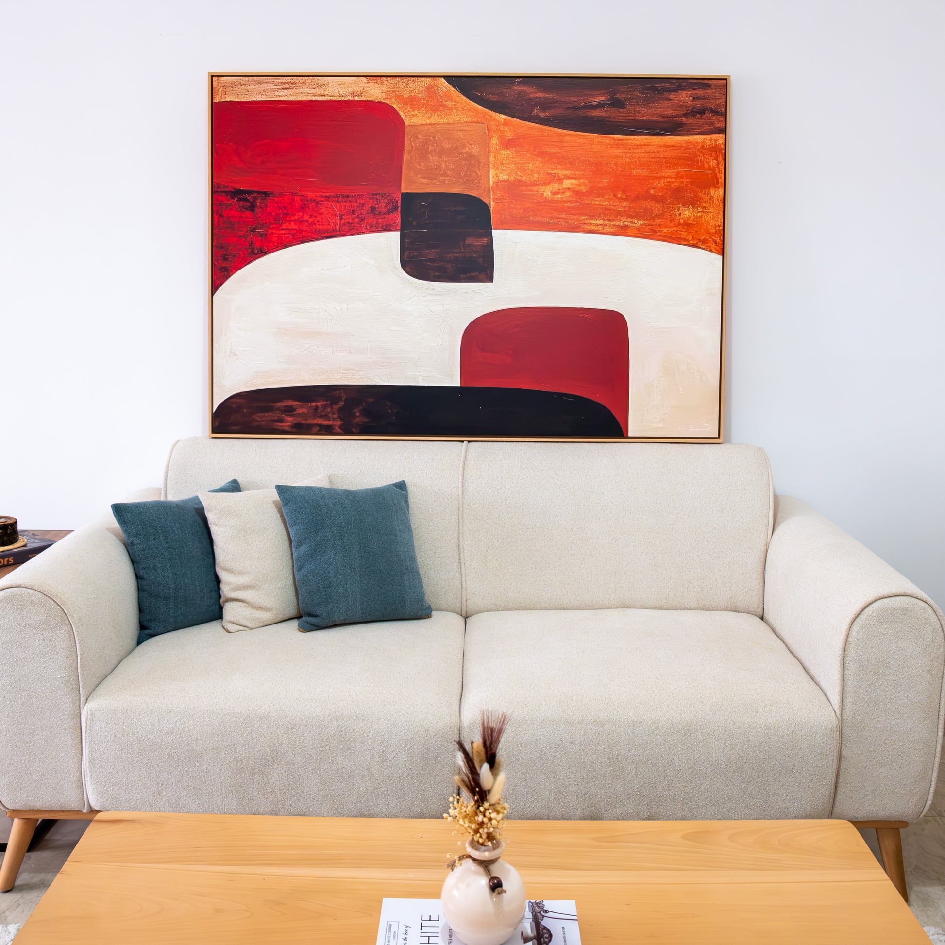 Entre rouge profond, ocre et ivoire, ce tableau crée une harmonie visuelle apaisante. Équilibre Terracotta est la pièce idéale pour sublimer un salon contemporain avec une touche artistique raffinée.