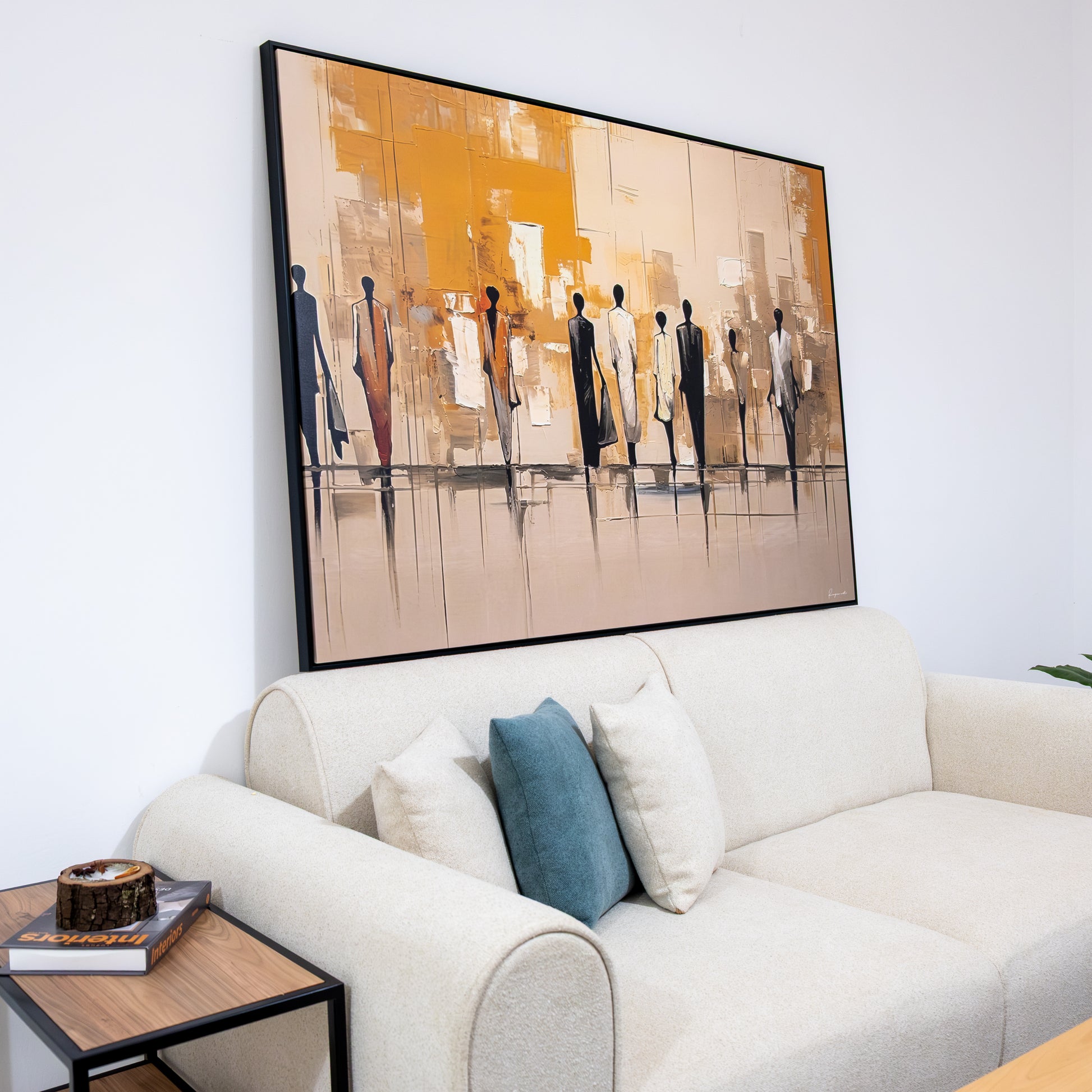Œuvre contemporaine aux lignes élancées et aux contrastes élégants, représentant une procession de silhouettes humaines en marche. Les tons chauds et neutres, mêlés à une abstraction urbaine subtile, insufflent dynamisme et modernité, parfaits pour sublimer un intérieur chic et design.